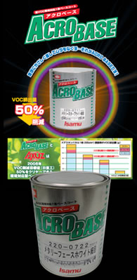 アクロベース■概要■概要アクロベースは、環境対応の1液型ベースコートです。 優れた隠ぺい性とボカシ作業性を実現し、経験が少ない方でも簡単に 塗装ができます。イサム塗料が誇る豊富な実車配合データ「カラー工房」 で調色作業も大幅に短縮できます。 シンナー希釈率50~70%で塗装可能なので、VOC排出量を大幅に低減 することが できます。 ■詳細■詳細