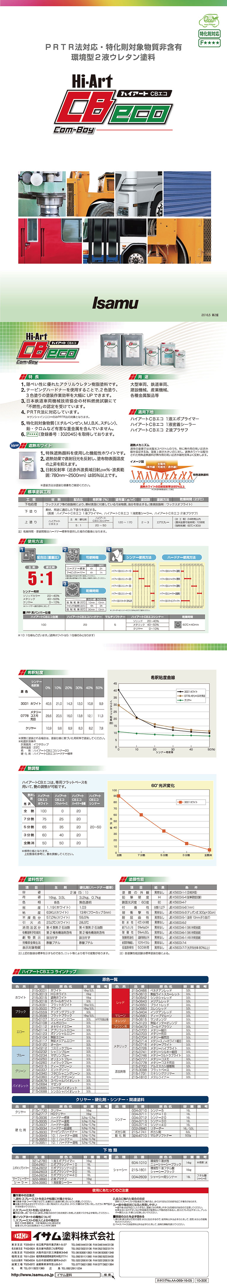ハイアート CBエコ■概要ハイアートCBエコは、隠ぺい性に優れた2液ウレタン樹脂塗料です。 特化則・PRTR法に対応しており、大型車両や工業用途に最適な塗料です。 ハードナー(硬化剤)、希釈剤を使い分けることで、様々な塗装条件に 応じて塗装作業性を向上させることが可能です。 ■詳細