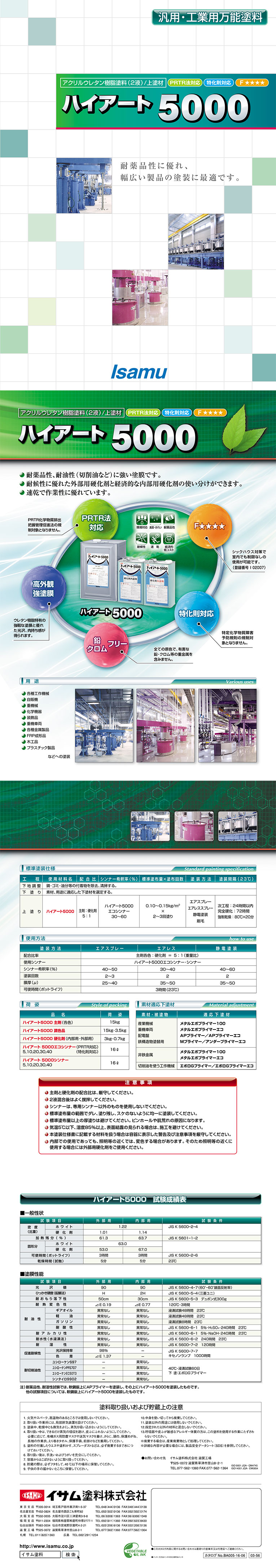 ハイアート5000■概要ハイアート5000は強い塗膜と、優れた光沢・肉持ち感が得られる2液型 アクリルウレタン樹脂塗料です。また、特化則・PRTR法対応の環境対応 アクリルウレタン塗料です。 ■詳細