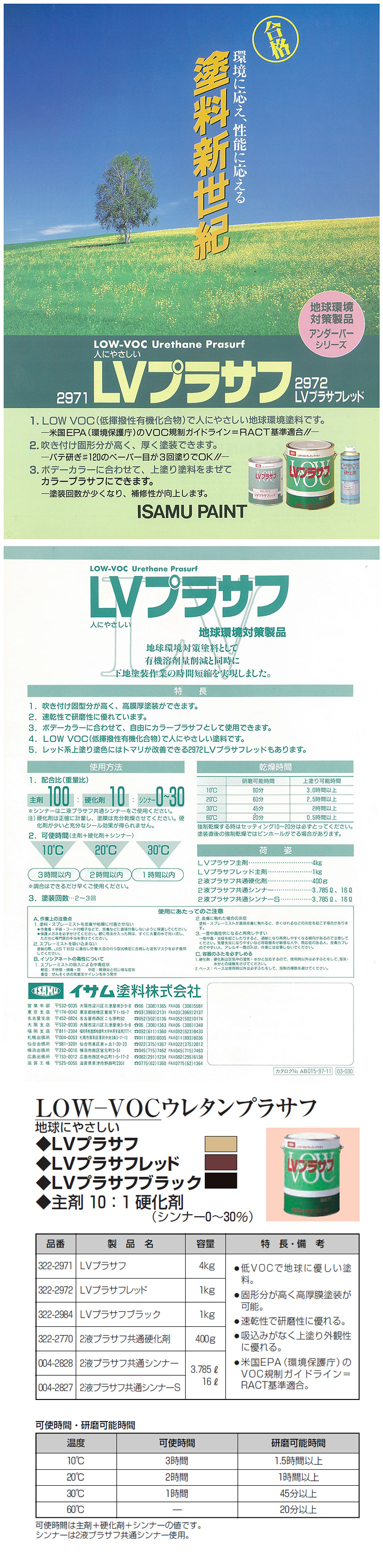 LVプラサフ低VOCタイプのウレタンプラサフ。固形分が多く、厚膜塗装ができます。 速乾性で、研磨性に優れ、吸い込みがないので上塗りの外観性を高めます 2液プラサフの定番商品。 厚膜性、吸い込み性の優れた速乾性の2液サフです。 ・2液ウレタンサフの定番商品 ・乾燥性が良く作業性が良い ・初めて2液型ウレタンサフをお使いになる方にお勧め。 10:1タイプのウレタンプラサフです。 密着力、防錆力に優れてます。 ウルトラサフと比較すると、LVプラサフの方が乾燥が早く塗膜が堅めです。 色味はベージュ系です。 乾燥時間は2時間(20℃)です。 研磨可能時間 10℃:90分 20℃:60分 30℃:45分 60℃:20分 上塗り可能時間 10℃:3時間以上 20℃:2.5時間以上 30℃:2時間以上 60℃:0.5時間以上 配合比 主剤(LVプラサフ):硬化剤:シンナー 100:10:0~30% ※シンナーは2液プラサフ共通シンナーを使用。 ※硬化剤は2液プラサフ用硬化剤を使用。