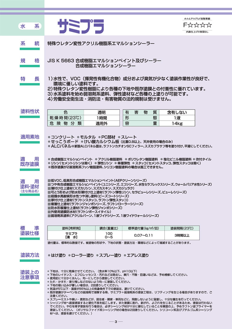 サミプラ■特徴・機能●水性特殊ウレタン変性アクリル樹脂エマルション系 「透明」シーラーです。 ●特殊ウレタン変性タイプで、各種下地や既存塗膜との付着性に 優れています。 ●既存塗膜を侵す心配がない水系です。 ■概要