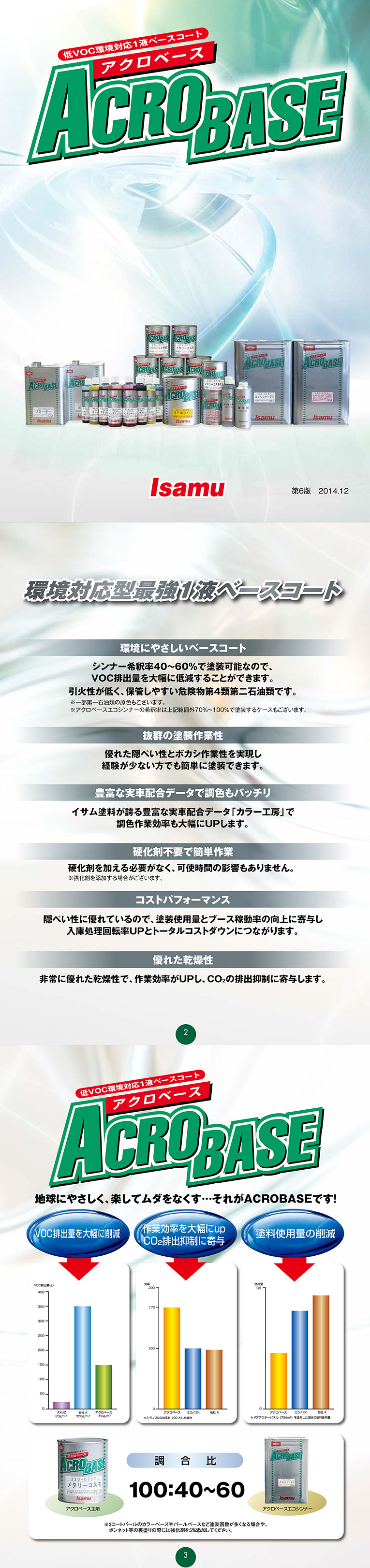 アクロベース■概要■概要アクロベースは、環境対応の1液型ベースコートです。 優れた隠ぺい性とボカシ作業性を実現し、経験が少ない方でも簡単に 塗装ができます。イサム塗料が誇る豊富な実車配合データ「カラー工房」 で調色作業も大幅に短縮できます。 シンナー希釈率50~70%で塗装可能なので、VOC排出量を大幅に低減 することが できます。 ■詳細■詳細