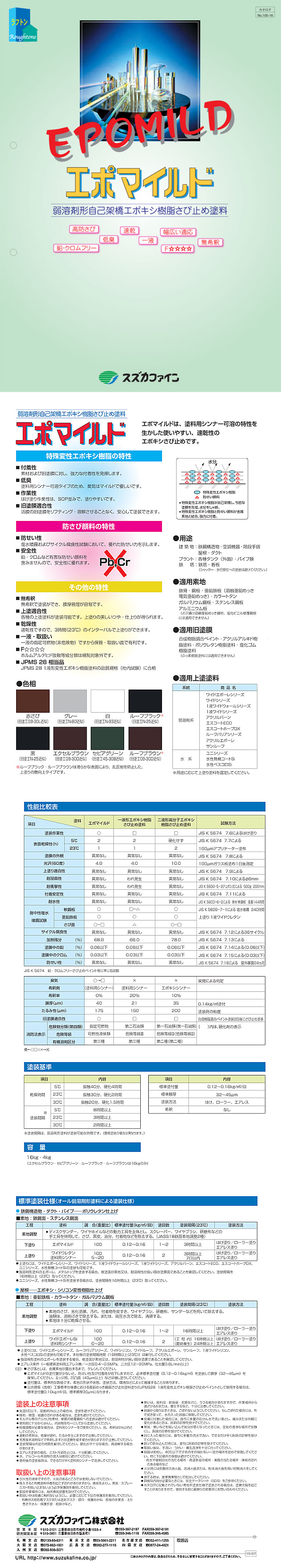 エポマイルド■特徴・機能●弱溶剤1液反応硬化形エポキシ樹脂系のさび止め塗料です。 ●反応硬化形エポキシ樹脂系タイプですので、密着性・防錆性に 優れています。 ●ターペン可溶タイプなので、強溶剤タイプと比較し臭気がマイルドで、 既存塗膜のチヂミや溶解が少なく、幅広い旧塗膜に適応します。 ●有害な鉛・クロムなどの重金属を含む防錆顔料を使用しておりません。 ●1液無希釈タイプなので取り扱いも簡単です。 ●ワイドエポーレシリーズ ・ワイドシリーズなどの下塗として最適です。 ■概要
