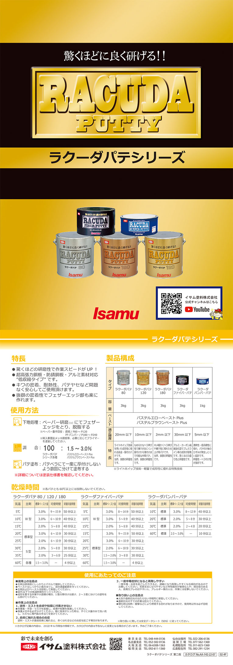 | ≪パステルエローペーストについて≫ ※ 本製品はイサム塗料従来品パテにも使用可能ですが、その際は2~3%の混合量を 厳守してください。 ※ 従来品パテに使用する場合、S型が不要となるメリットを得ることはできません。 通常品は夏季にS型を用いてください。 ※ 研磨性の向上はラクーダパテとの組み合わせにより実現される機能であり、 従来品の研磨性が向上するわけではありません。 パステルエローペーストはラクーダパテにおいて研磨性向上実現のカギとなる製品です。 従来品と異なり、ラクーダパテは混合量を調整することによって標準型の主剤が夏季での 使用でも可能となります。 (このためラクーダパテにはS型がありません) |